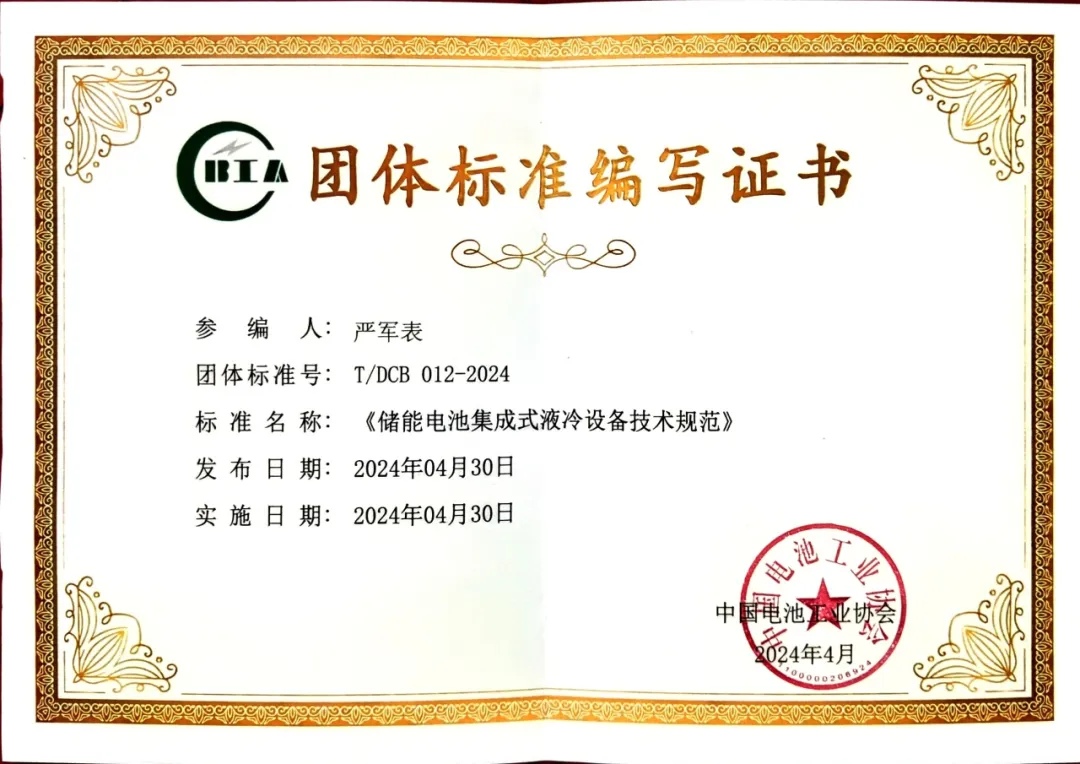 随着"双碳"目标的深化,全球储能温控行业得到快速发展并不断扩大市场范围及应用领域,储能温控系统作为电池储能系统的关键零部件,应更具规范化、标准化、满足市场更高需求。澳卡威首席技术专家、前瞻性技术开发总顾问——严军表,深耕车用化学品领域15年,主导参与过制定尿素溶液、防冻液、低温催化还原剂等多项行业和团体标准,此次代表浙江澳卡威科技有限公司参与制定,由中国电池工业协会归口的《储能电池集成式液冷设备技术规范》团体标准,已于2024年4月30日发布并正式实施。